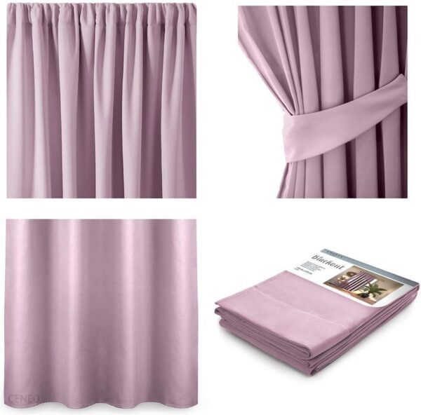 Zasłony Blackout na taśmieRozmiar: 140×245 cmKolor: różowyMateriał: 100% poliesterStopień zaciemnienia: 90%Pielęgnacja: Prać maksymalnie w 30 C. Nie można chlorować, nie można suszyć w suszarce automatycznej. Prasować jedynie w niskiej temperaturze. Można czyścić chemicznieMarka: AmeliaHomeW zestawie: 1 x zasłona, 1 x upięcie (wymiary 62 cm ⟶, 10 cm ↑)Dodatkowe informacje: Zasłonę można zawiesić na dwa sposoby: przy pomocy haczyków bądź wsuwając tkaninę na kaisz.