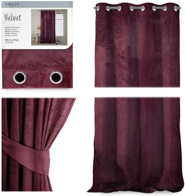 Zasłony Velvet na przelotkachRozmiar: 140×270 cmKolor: burgundowyMateriał: 100% poliesterStopień zaciemnienia: 77%Ilość przelotek: 8 sztukŚrednica przelotki: wewnętrza – 4 cm, zewnętrza – 6 cmOdległość między góą częścią tkaniny i przelotką: 2,5 cmOdległość pomiędzy dolną częścią tkaniny i przelotką: 261,5 cmPielęgnacja: Prać w temperaturze 30 stopni Celsjusza. Prasować tylko w niskiej temperaturze. Można czyścić chemicznie. Nie wybielać. Nie suszyć w suszarce bębnowej.Marka: AmeliaHomeW zestawie: 1 x zasłona, 1 x upięcie (wymiary 62 cm ⟶, 10 cm ↑). Całość zapakowana w opakowanie PCV z zamkiem i wieszakiem w kolorze czarnym.Dodatkowe informacje: Zasłony Velvet zrobione zostały z gładkiego, delikatnie połyskującego materiału, wyglądem przypominającego elegancki aksamit. Aby zawiesić zasłonę na przelotkach wystarczy wsunąć ją na kaisz.