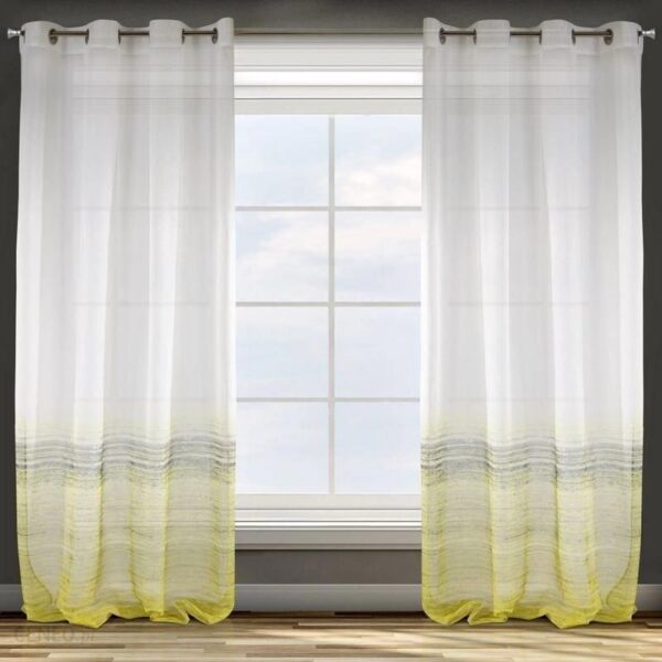 Delikatna zasłona z etaminy z nadrukiem w kolorze szarości i musztardowym. Dół ozdobiony kolorowym akcentem z efektem przenikania szarych i złotego. szerokość: 140 cm, długość: 250 cm, kolor: biały, Gramatura: 70 GSM, Skład: 100% poliester