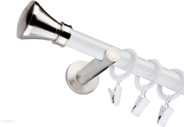KARNISZE – kolekcja VENTO 19 MMKolekcja VENTO charakteryzuje się tym że zakończenia oraz wsporniki koloru stali nierdzewnej łączą się z drążkiem oraz żabkami malowanym proszkowo w kolorze białym lub czarnym.Połączenie tych kolorów wpływa nie tylko na wygląd, styl czy charakter wnętrza, ale przede wszystkim na samopoczucie domowników.Estetyczne a zarazem funkcjonalne wsporniki otwarte, mocowane do ściany lub sufitu, sprawiają że założenie poprzecznego drążka jest bardzo proste.Występują w dwóch wersjach jako karnisz pojedynczy lub podwójny.Zakończenia oraz wsporniki łączymy do wyboru z drążkiem biały połysk lub czarny mat.Karnisze w całości występują w rozmiarach: 120, 130, 140, 160, 180, 200, 220, 240 cm.Karnisze powyżej 240 cm są łączone w rozmiary: 260, 280, 300, 320, 340, 360, 380, … , 720 cm.W przypadku jeśli jest wymagana inna długość, np. 310 cm proszę dopisać w uwagach na jaki rozmiar przyciąć karnisz.W kolekcji VENTO 19 mm, mamy do wyboru sześć zakończeń:Beluno,Cylinder,Kula max,Koloseo,Luna,Stożek